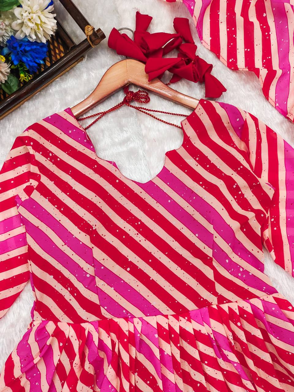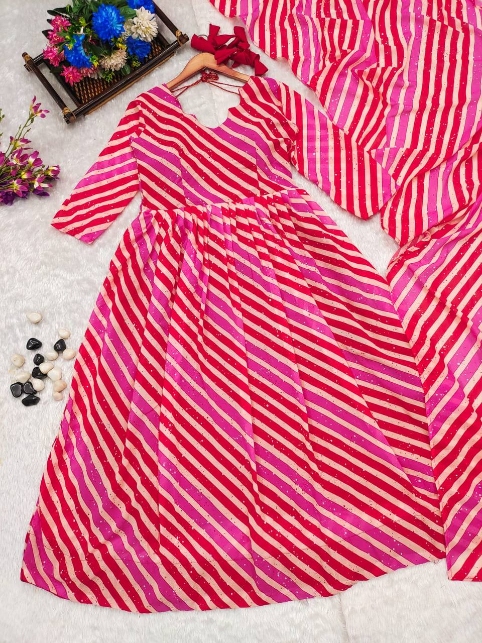 Introducing our stunning Leheriya suit set in luxurious Georgette fabric. Exquisite craftsmanship and vibrant patterns make it perfect for any occasion. Elevate your style with this timeless, elegant piece