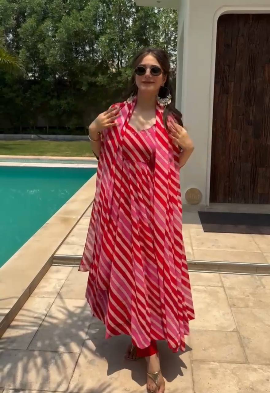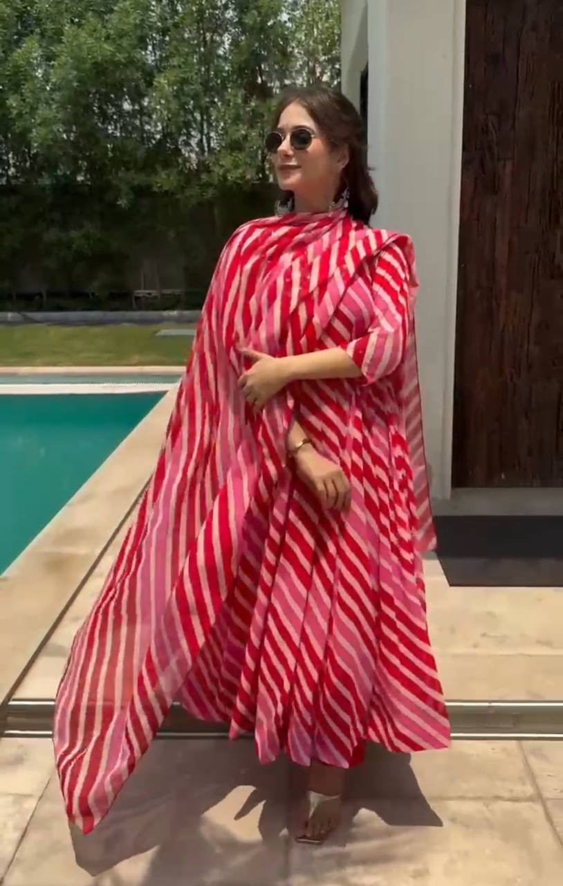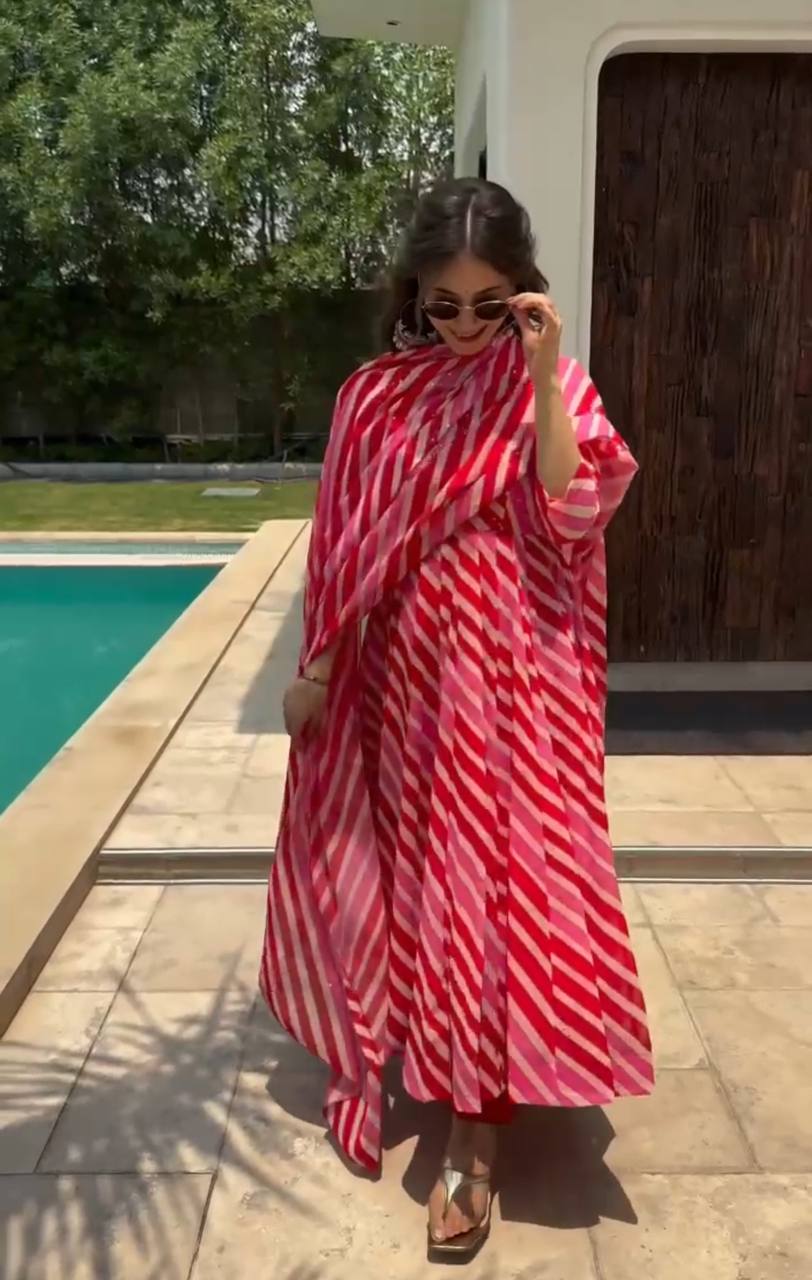 Sparkle Red Leheriya Fox Georgette 3 piece Anarkali Suit Set