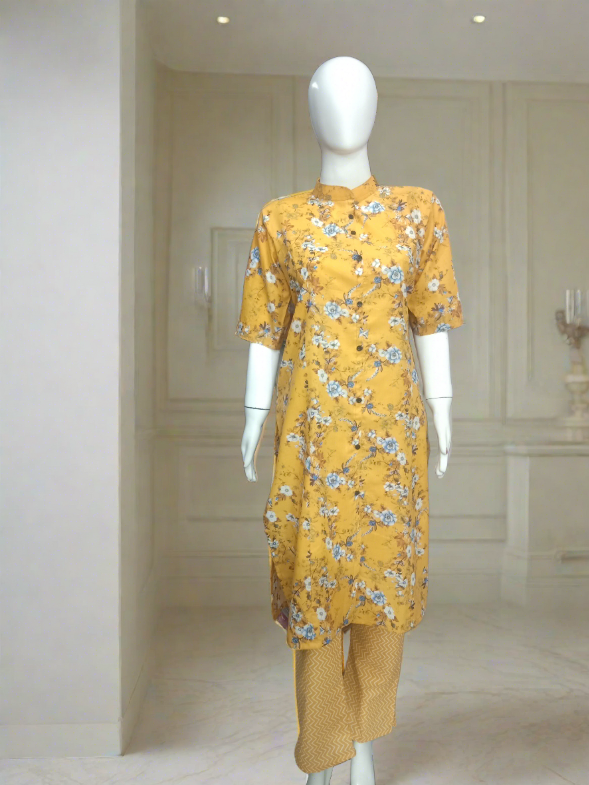 Elevate your ethnic style with our printed cotton Co-ords kurta and pant set. Made from 100% cotton, this set features a V-neck collar and full-printed pants with a unique zig-zag design. Limited pieces are available, so don't miss out! Use code "EXTRA5" for an extra 5% off at checkout. Available in yellow, pink, blue, and green, sizes M-XXL. Don't wait, add this readymade set to your wardrobe today!